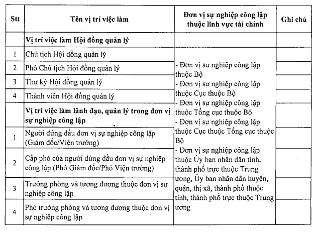 Danh mục vị trí việc làm lãnh đạo, quản lý gồm các vị trí như sau: